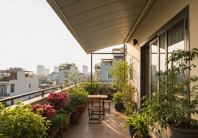 - Sân thượng, ban công: Biến sân thượng hay ban công thành khu vườn nhỏ, nơi thư giãn lý tưởng mà không ngại nắng gắt hay những cơn mưa bất chợt của mùa thu. Nhiều gia đình lựa chọn mái che sân thượng để tạo không gian đọc sách, uống trà hoặc trồng cây cảnh.