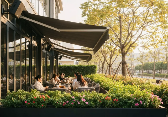 Mái xếp lượn sóng: Kiểu dáng đẹp mắt, dễ thu – mở linh hoạt, phù hợp sân vườn, quán cafe, nhà hàng.