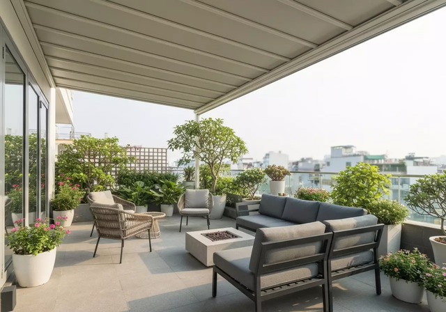 - Sân thượng, ban công: Biến các khu vực này thành không gian thư giãn, trồng cây cảnh lý tưởng quanh năm, không ngại nắng mưa. Đây là giải pháp mái che sân thượng được ưa chuộng nhất trong năm 2025.